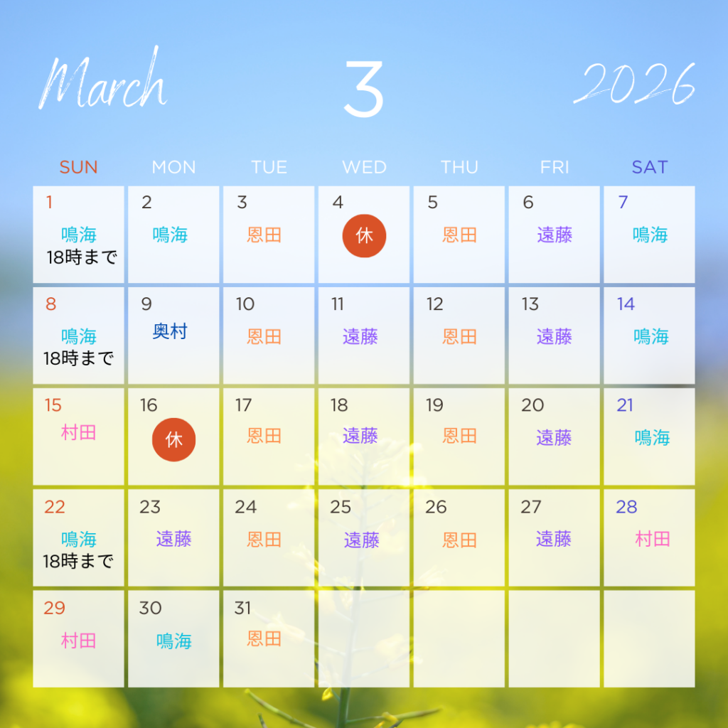 2026年3月 診療スケジュール 2026 2/11 お知らせ/休診情報 2026年2月20日 平素より当院をご利用いただき、誠にありがとうございます。2026年3月の診療日および担当医スケジュールをお知らせいたします。 お知らせ/休診情報 よかったらシェアしてね! URLをコピーしました! URLをコピーしました! 【太りにくい体質へ】メトホルミン取り扱い開始しました✨
