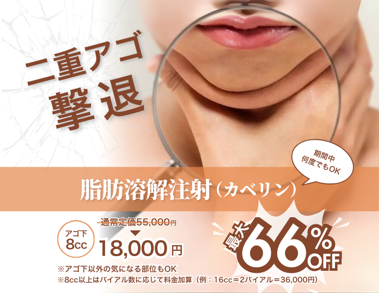脂肪を分解・排出を促す薬剤を気になる部位に注射する施術。部分痩せが可能で、特に あご下やフェイスライン、頬のもたつきに効果的です。