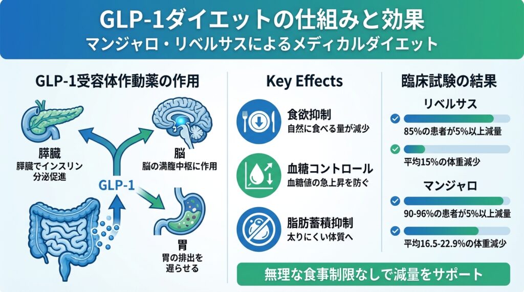 GLP-1は食後に小腸から分泌されて膵臓に作用し、インスリン分泌を促進して血糖値を下げ、さらに脳の満腹中枢に働いて食欲を抑える作用があります。リベルサスとマンジャロはいずれもこのGLP-1の作用を体内で再現することで減量効果を発揮しますが、その投与法や作用の強さに違いがあります。