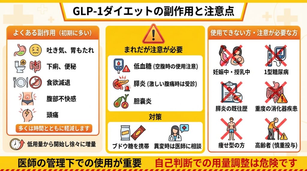 まず妊娠中・授乳中の方は使用できません。動物実験で胎児への悪影響(奇形や流産)が示唆されており、安全を期すため禁忌となっています。また、1型糖尿病の方には効果がないため使用不可です(インスリン分泌が枯渇する1型では本薬は無効なため)。加えて、過去に膵炎を起こしたことがある方、重篤な消化器疾患がある方、胃の手術歴がある方も事前に医師に申告してください。