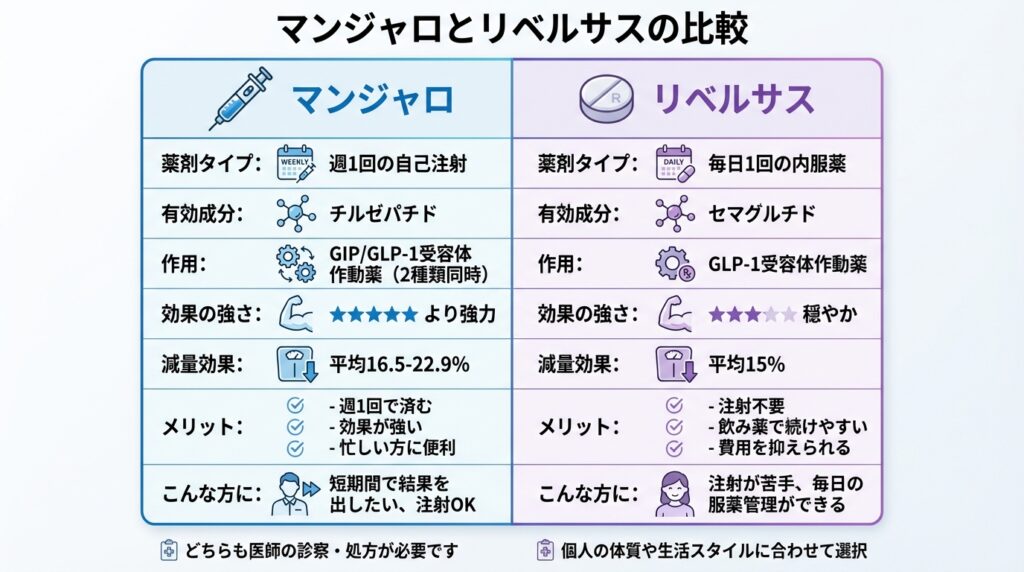 以上のように、リベルサスは「毎日飲む内服薬」でじっくり効くのに対し、マンジャロは「週1回の注射薬」でより強力に作用する点が仕組みの違いです。患者さんのライフスタイルや希望に応じて、飲み薬か注射かを選択できるのもGLP-1ダイエットの特徴と言えます。